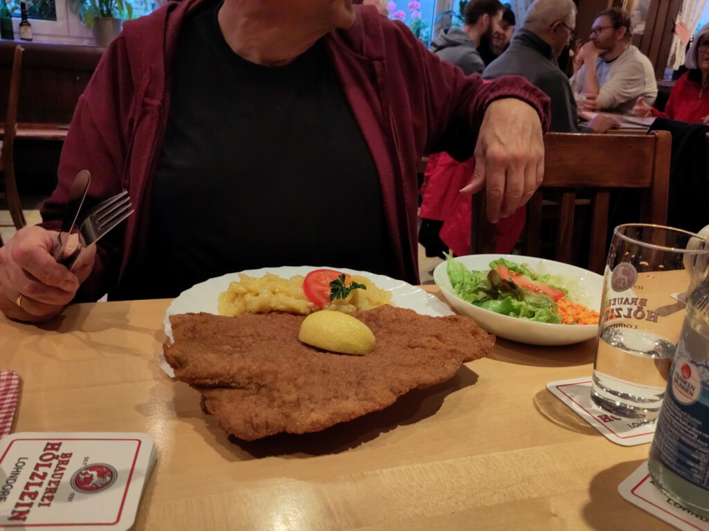 Nachdem die Bambergia zufällig heute Abend „Brotzeit beim Heiner in Lohndorf“ angesetzt hatte und es zeitlich gut passte, haben wir uns dort zum Abendessen angeschlossen. Für Rudi gab’s ein kleines Schnitzel, für mich Ziebeleskäs mit Kartoffeln.